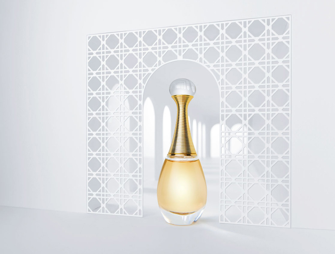 Test shot featuring iconic perfume and a miniature paper set with 3D printed signature Dior patterned frame.