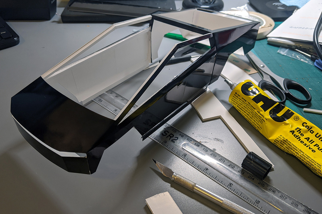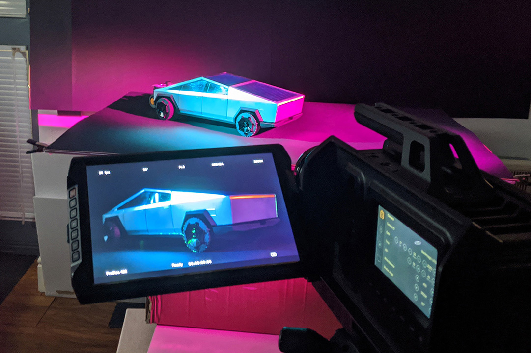 The making process: the truck designed in 3D and converted to cut patterns, the usage of cutter required due to high precision details and repetitive patterns, some electronics used for lights, motorized by camera trolley and gravity for some shots.