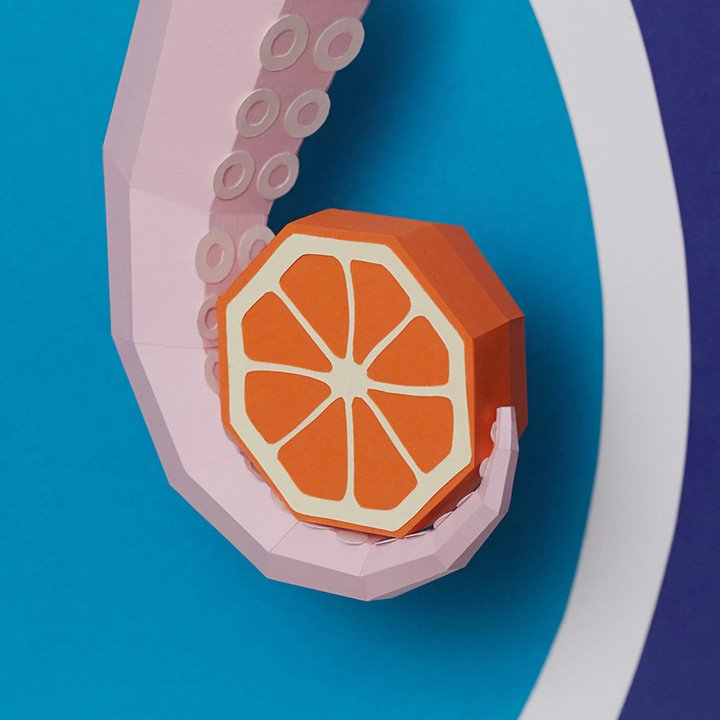 O is for Orange held by Octopus on Oyster background